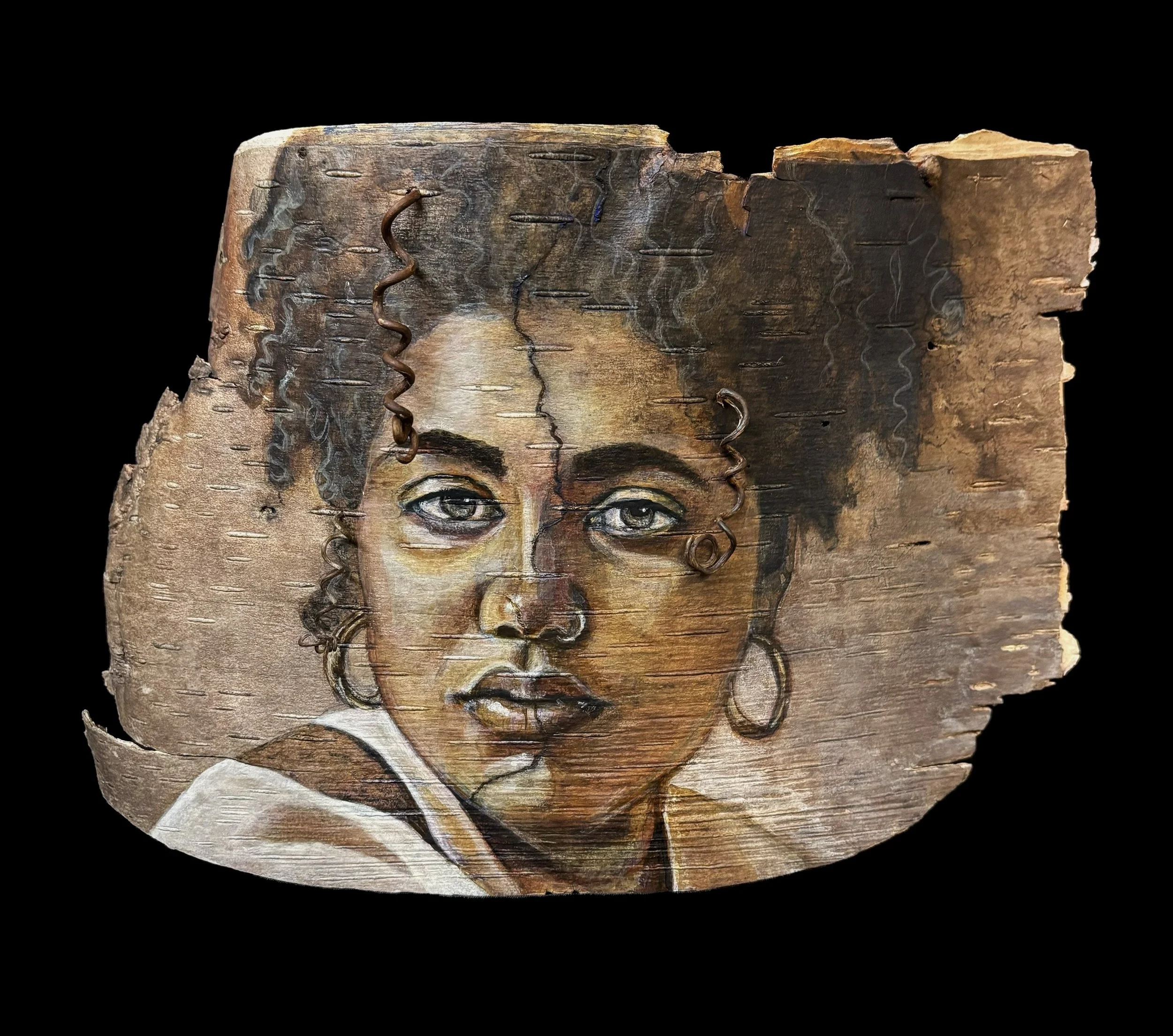 Since then I’ve collected bark pieces, each of which are attached to experiences and memories allowing them to hold a special meaning. My work is very intuitive. It usually begins with an image of a woman that speaks to me for some unknown reason. Sometimes, the woman just emerges from the substrate, such as a design I see in a piece of bark or from a background I’ve created. The title comes after my work is completed. Something about the work sparks a memory, a mood, an unknown part of history, or a connection to a personal experience or material. I often find myself in a rabbit hole of research until it clicks and I understand the message coming through each piece.